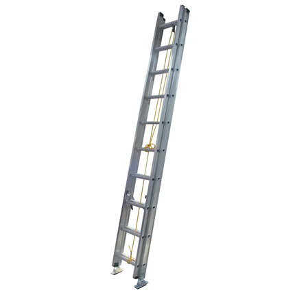 - Escalera profesional de doble sección fabricada en aluminio de alta resistencia. Incluye sistema de polea y cuerda para una extensión suave, junto con zapatas antideslizantes que brindan firmeza en terrenos planos.